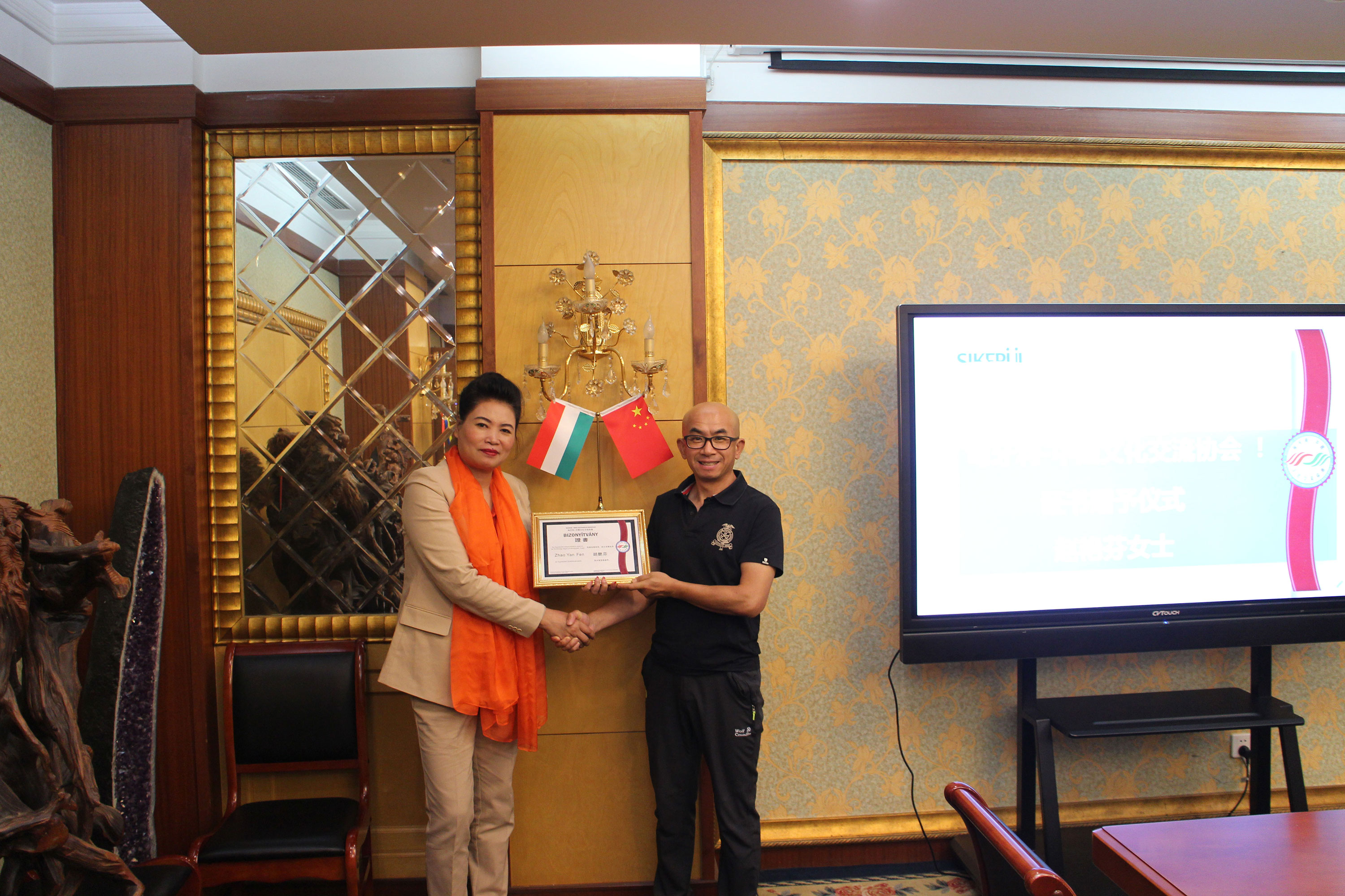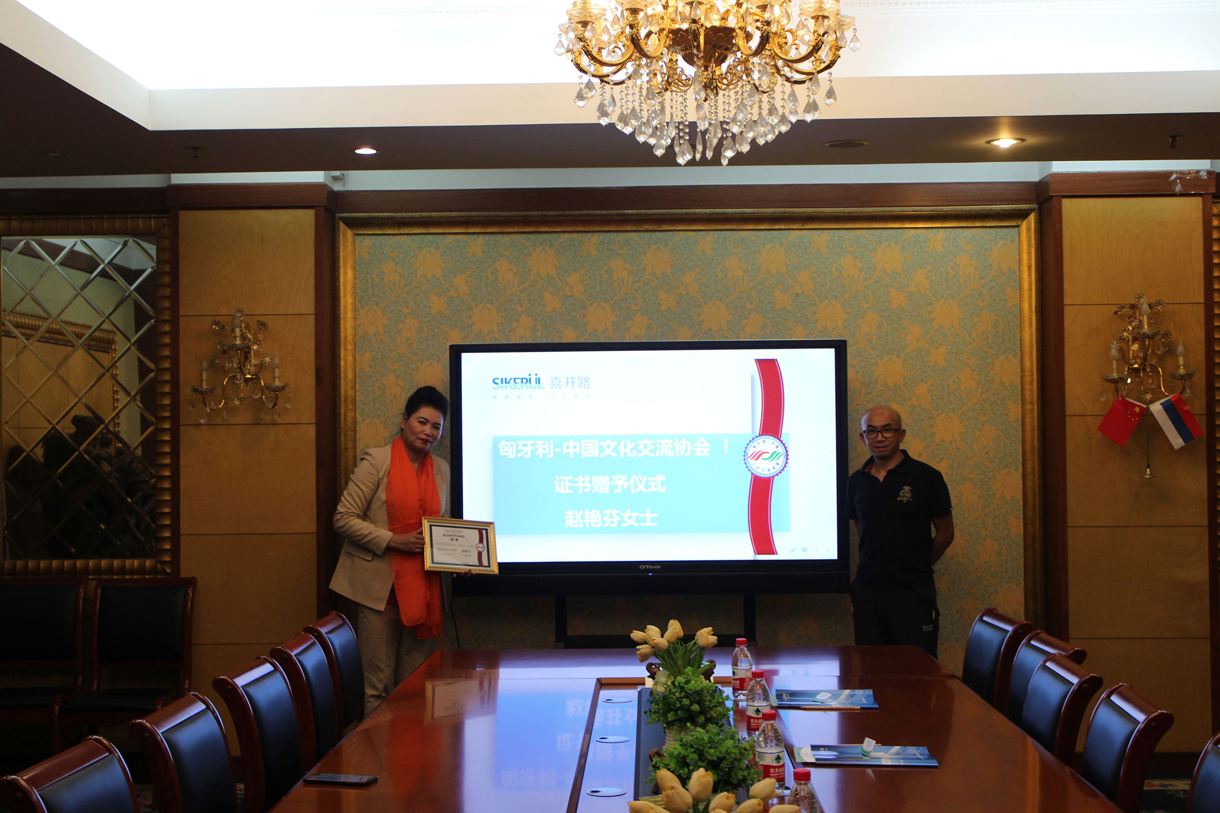 匈牙利-中国文化交流协会 授予喜开路公司董事长赵艳芬女士荣誉顾问证书。